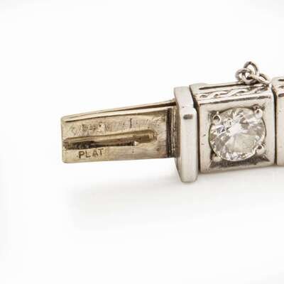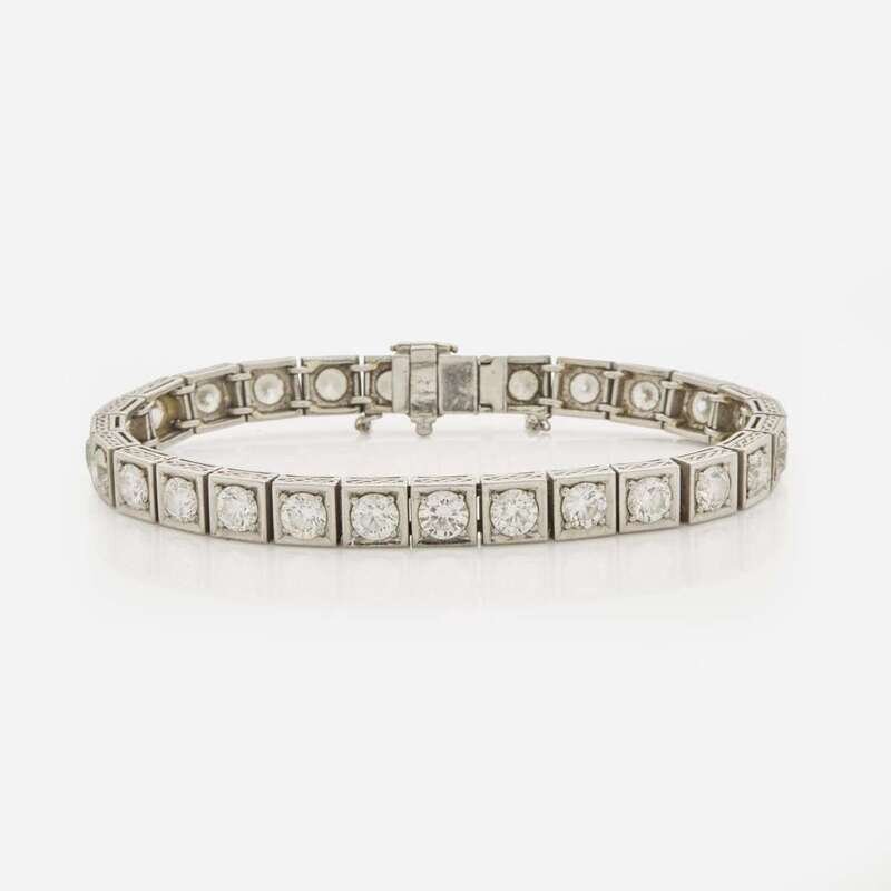 A late Art Deco platinum line bracelet set with twenty-seven round brilliant-cut diamonds. Diamonds are near colorless (G - I), with VS - SI clarity. Total estimated weight of diamonds: 10.00 carats.