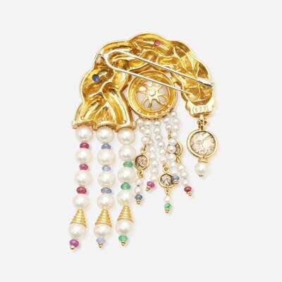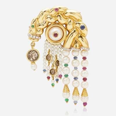 An 18K yellow gold brooch by Roberto Legnazzi in an amorphous design, featuring cabochon rubies and ruby beads, a cabochon sapphire and sapphire beads, a cabochon emerald and emerald beads, fifteen round-brilliant-cut diamonds, coins, and pearls.