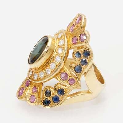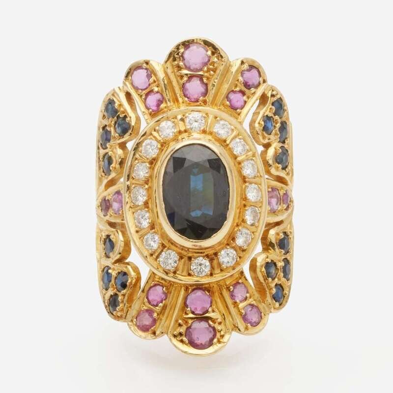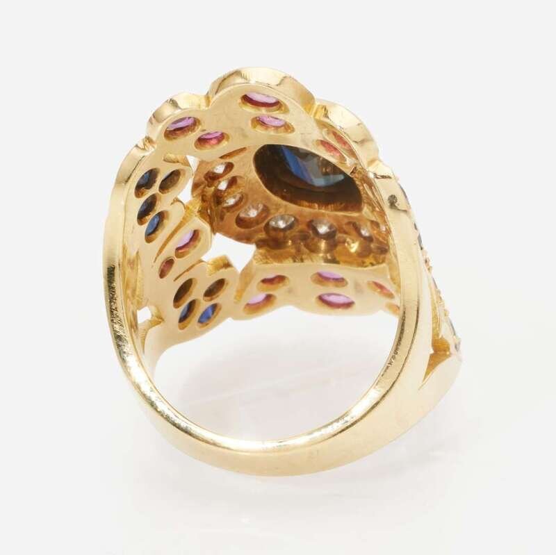 An 18K yellow gold ring centering an oval-cut sapphire measuring approximately 10.26mm x 7.34mm x 3.57mm, surrounded by round-cut rubies, sapphires, and diamonds. Diamonds are near colorless (G - H), with SI clarity. Total estimated weight of diamonds: 0.80 carats.