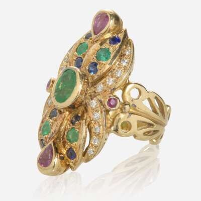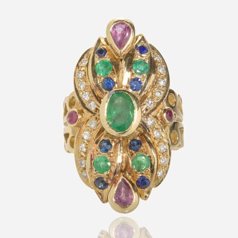 An 18K yellow gold ring centering an oval-cut emerald measuring approximately 7.34mm x 5.57mm, accented by four round-cut emeralds each measuring approximately 3.00mm, eight round-cut sapphires each measuring approximately 2.30mm, two pear-shape rubies each measuring approximately 5.50mm x 3.50mm, a round-cut ruby measuring approximately 2.00mm, and twenty round-cut diamonds each measuring approximately 1.30mm. Diamonds are near colorless (G - H), with VS clarity. Total estimated weight of diamonds: 0.20 carats.