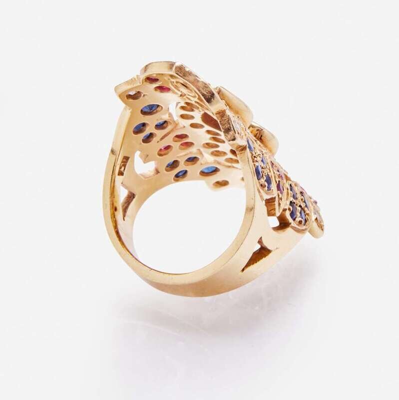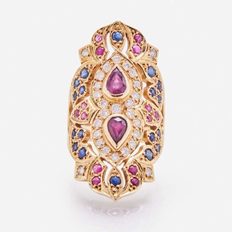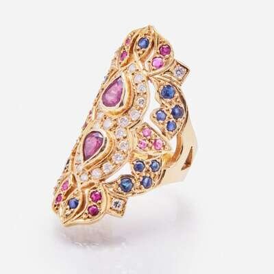 An 18K yellow gold ring, geometrically designed to feature two pear-shape rubies each measuring approximately 6.50mm x 5.00mm x 3.28mm and accented by fourteen round-cut rubies measuring from approximately 2.00mm at the smallest to 2.30mm at the largest, eighteen round-cut sapphires measuring from approximately 2.30mm at the smallest to 2.70mm at the largest, and twenty-nine round brilliant-cut diamonds measuring from approximately 2.00mm at the smallest to 2.40mm at the largest. Diamonds are near colorless (G - H), with SI clarity. Total estimated weight of diamonds: 0.85 carats.