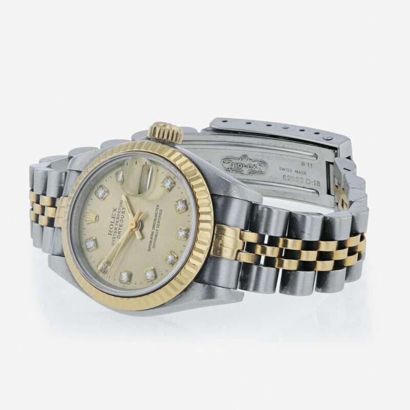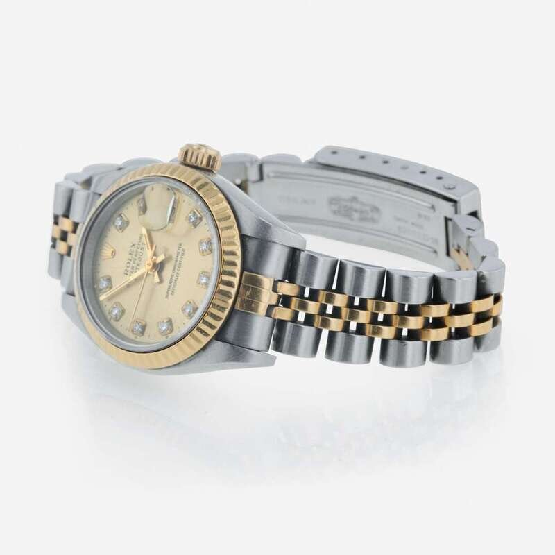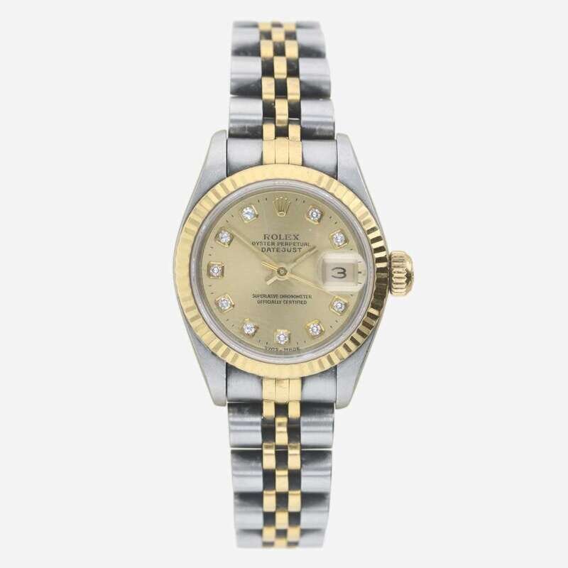 A lady's Rolex watch 18K/SS, automatic self-winding movement, champagne dial with applied diamond markers. With date complication, two-tone jubilee bracelet, fluted gold bezel, and crown.