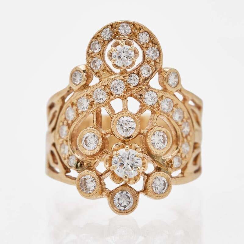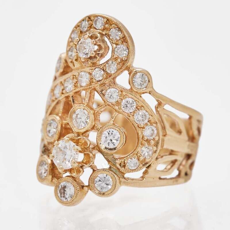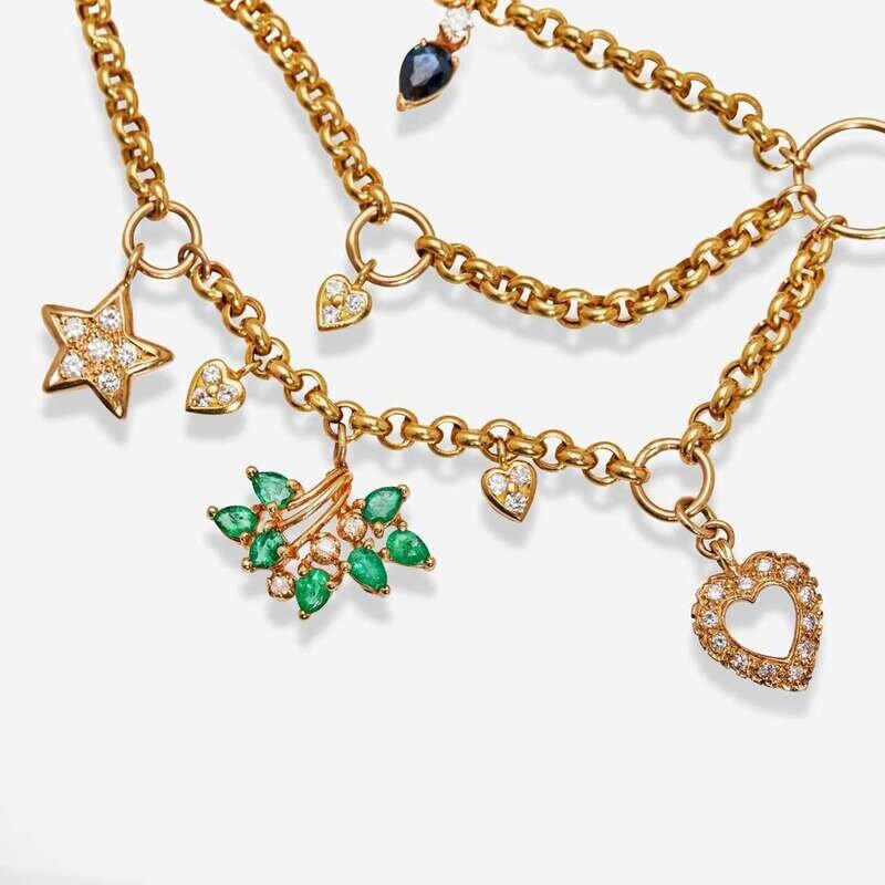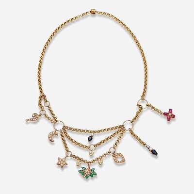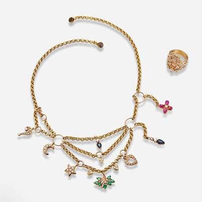 A 14K yellow gold cable-link swag necklace with ten 14K yellow including diamond-set hearts, a diamond-set star, a diamond-set half-moon, a diamond-set question mark, two pear-shape sapphires with accent diamonds, pear-shape emeralds with accent diamonds, and one 18K yellow gold charm set with cabochon rubies and an accent diamond. The 14K yellow gold ring is set with thirty-one round brilliant-cut and single-cut diamonds, near colorless (G - H), with VS clarity. Total estimated weight of diamonds on ring: 1.40 carats.