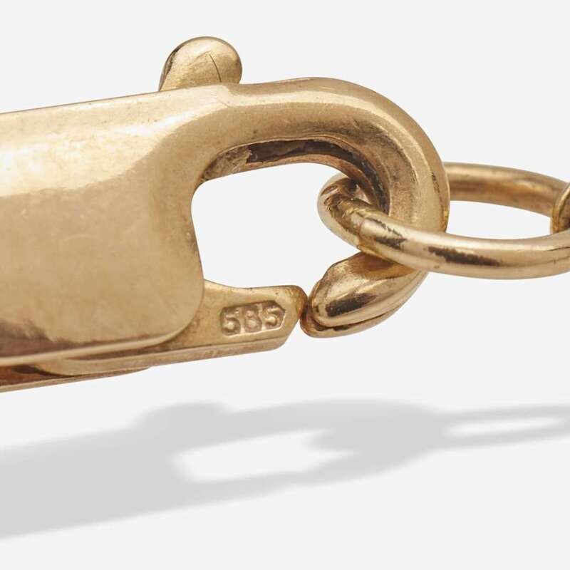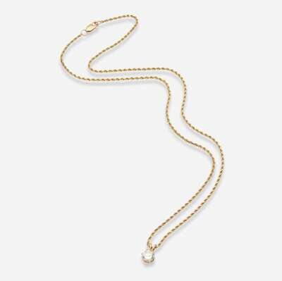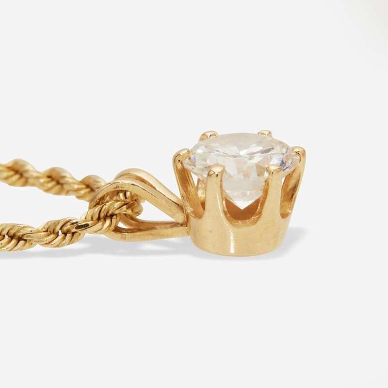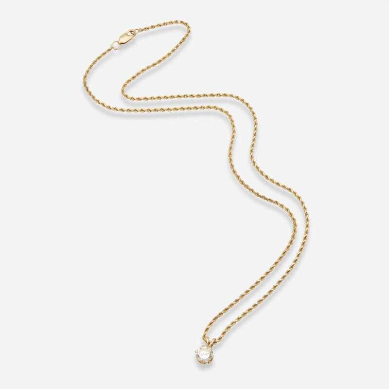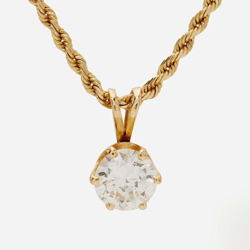 A 14K yellow gold twisted rope chain with a 1.00 carat round brilliant-cut diamond solitaire pendant set in yellow gold. Diamond is near colorless (H), with VS1 clarity, and inert fluorescence. Accompanied by GIA Report Number: 2221841070.