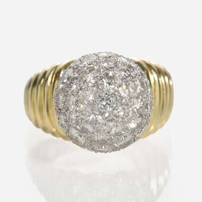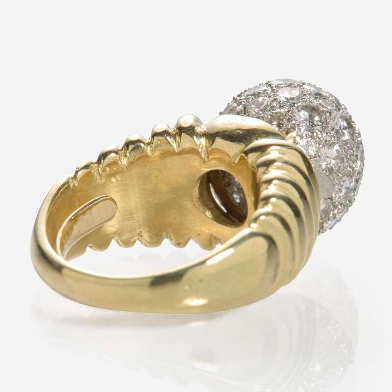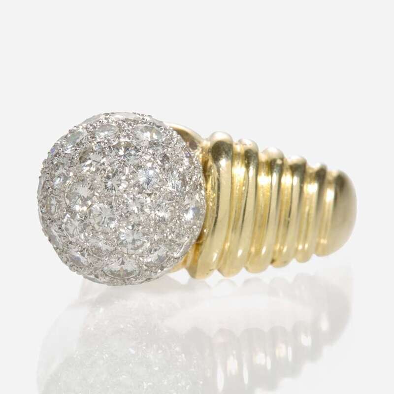 An 18K yellow gold ribbed shank ring with a pavé-set diamond ball in 18K white gold. Set with fifty-four round brilliant-cut diamonds, near colorless (F - H), with VS clarity. Total estimated weight of diamonds: 6.00 carats.