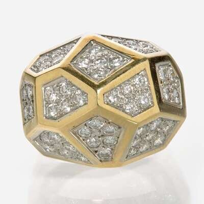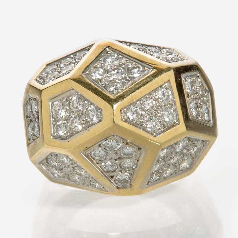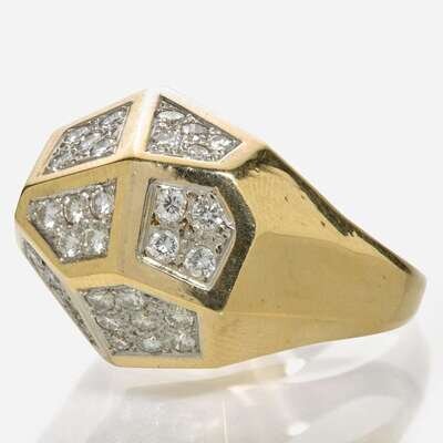 An 18K yellow gold ring, designed in a geometric style and pavé-set with fifty-four round brilliant-cut diamonds. Diamonds are near colorless (H - J), with SI clarity. Total estimated weight of diamonds: 1.60 carats.