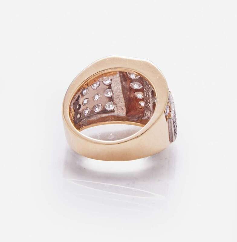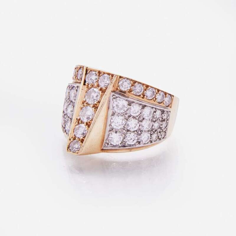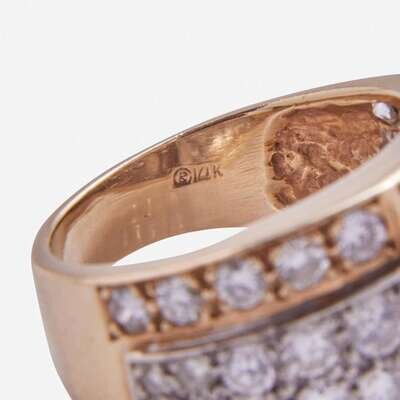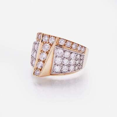 A 14K yellow gold ring, geometrically designed and set with forty-six round brilliant-cut diamonds. Diamonds are near colorless to faint color (I - K), with SI1 - I1 clarity. Total estimated weight of diamonds: 2.80 carats.