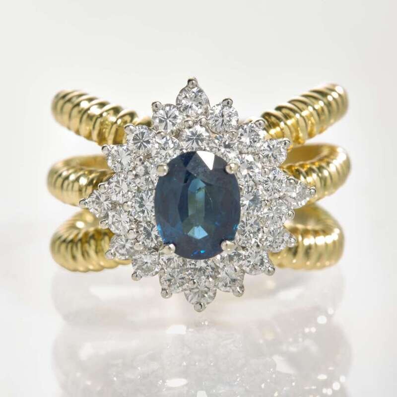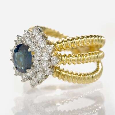 An 18K yellow gold ring designed as three textured shanks and centering an oval-cut sapphire measuring approximately 7.68mm x 6.00mm surrounded by a halo of thirty-two round brilliant-cut diamonds. Diamonds are near colorless (F - G), with VS clarity. Total estimated weight of diamonds: 1.50 carats.