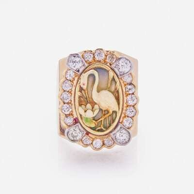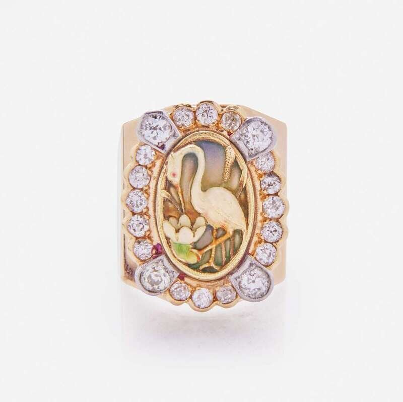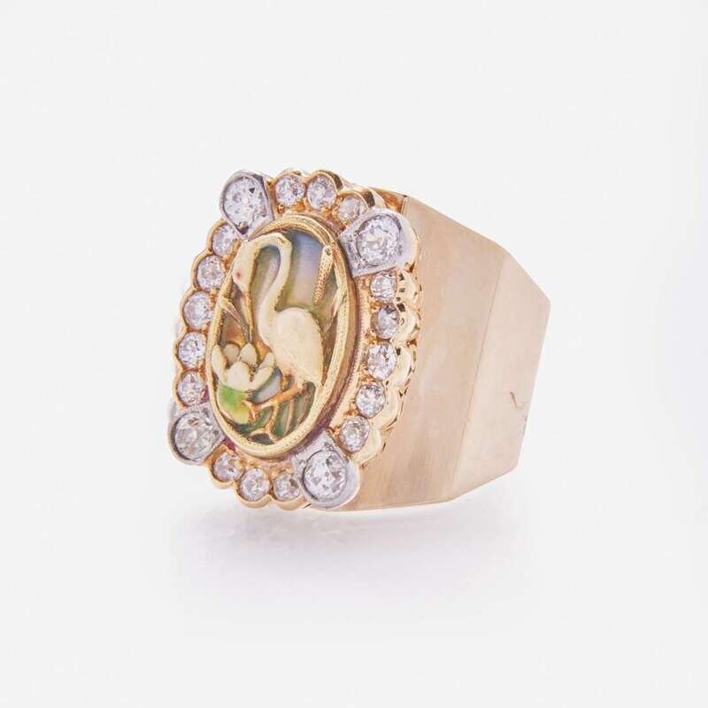 A 14K yellow gold Art Nouveau ring centering a plique-a-jour enamel crane motif surrounded by a diamond halo set in bezels with milgrain edge. The twenty old European-cut diamonds are near colorless (I - J), with SI clarity. Total estimated weight of diamonds: 1.60 carats.