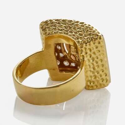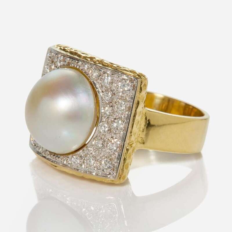 An 18K yellow gold ring featuring a textured box that centers a mabé pearl measuring approximately 12.70mm, surrounded by thirty round brilliant-cut diamonds. Diamonds are near colorless (G - I), with VS clarity. Total estimated weight of diamonds: 1.20 carats.