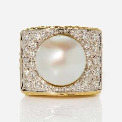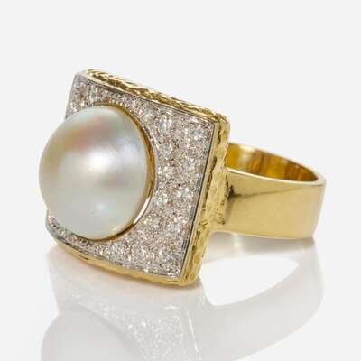 An 18K Yellow Gold, Pearl, and Diamond Ring