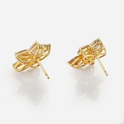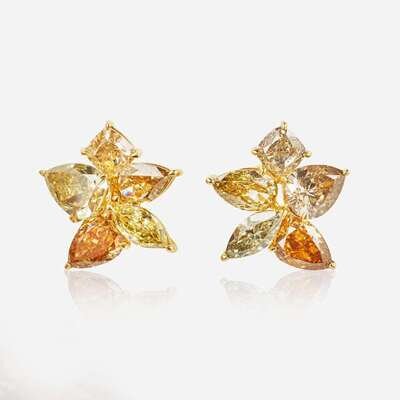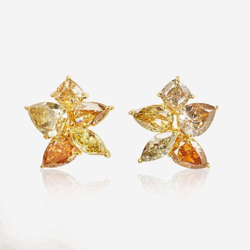 A pair of 18K yellow gold cluster earrings on stud posts, set with ten fancy colored diamonds including yellow, orange, and brown, of varying shape and size including marquise-cut, pear-shape, and modified square-cut, with SI - I clarity. Total estimated weight of diamonds: 10.70 carats.