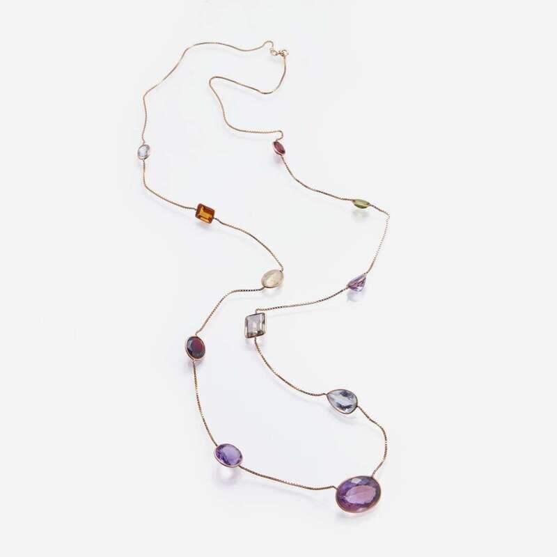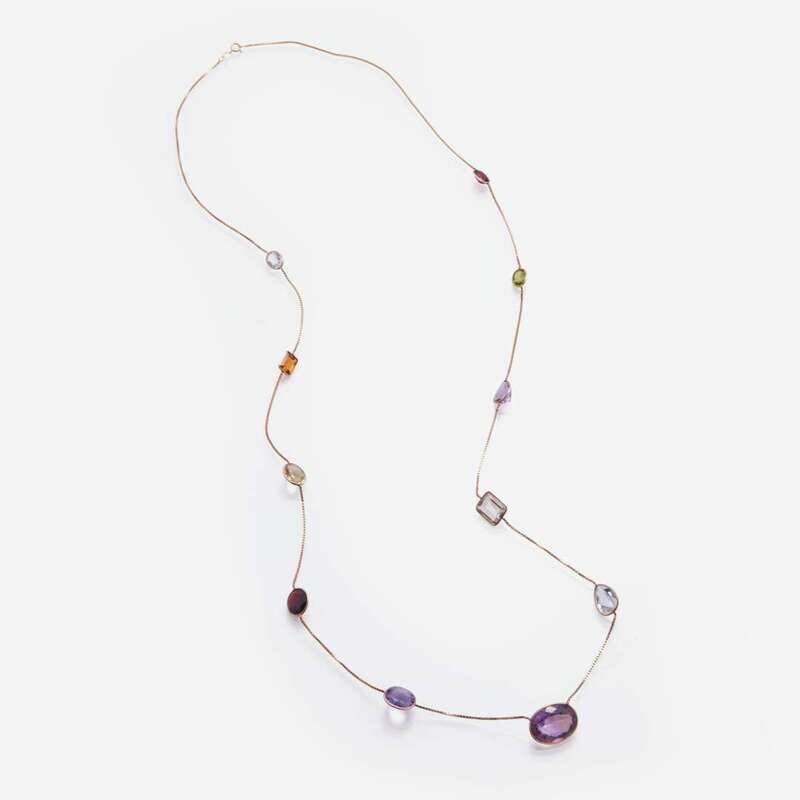 A 14K yellow gold Italian station necklace, set with oval-cut, round-cut, and pear-shape gemstones, including citrine, quartz, amethyst, garnet, blue topaz, and peridot.