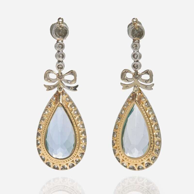 A pair of 14K Edwardian earrings converted to earring jackets, designed as drop earrings featuring pear-shape aquamarines each measuring approximately 19.70mm x 9.96mm x 6.70mm, surrounded by ninety-six old European and round-cut diamonds. Diamonds are near colorless (I - J), with I clarity. Total estimated weight of diamonds: 1.60 carats.