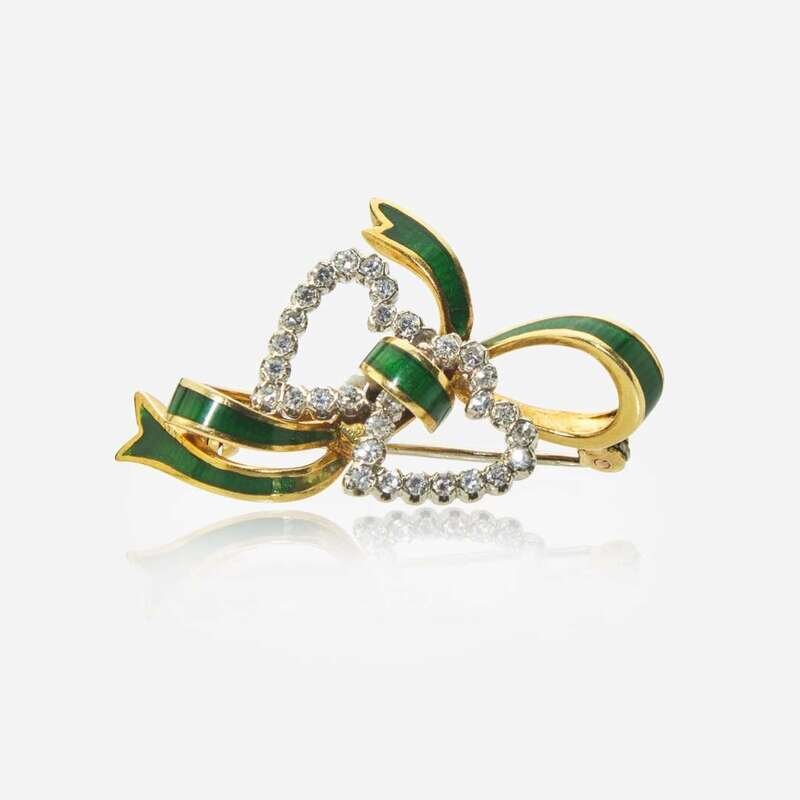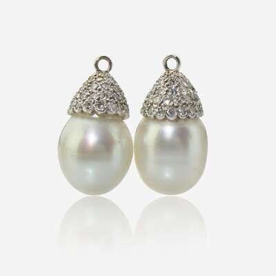 A guilloche enamel bow-shaped pin featuring two hearts fashioned from single-cut diamonds, and a pair of 10K white gold earring jackets each featuring a semi-baroque cultured pearl and pavé-set round brilliant-cut diamonds. Pin features thirty single-cut diamonds, near colorless (I - J), with SI clarity and total estimated carat weight of 0.35 carats. Earring jackets feature two semi-baroque cultured pearls each measuring approximately 14.60mm x 12.60mm, and approximately one hundred round brilliant-cut diamonds, near colorless (I - J), with SI1 - I1 clarity, and a total estimated carat weight of 2.00 carats.