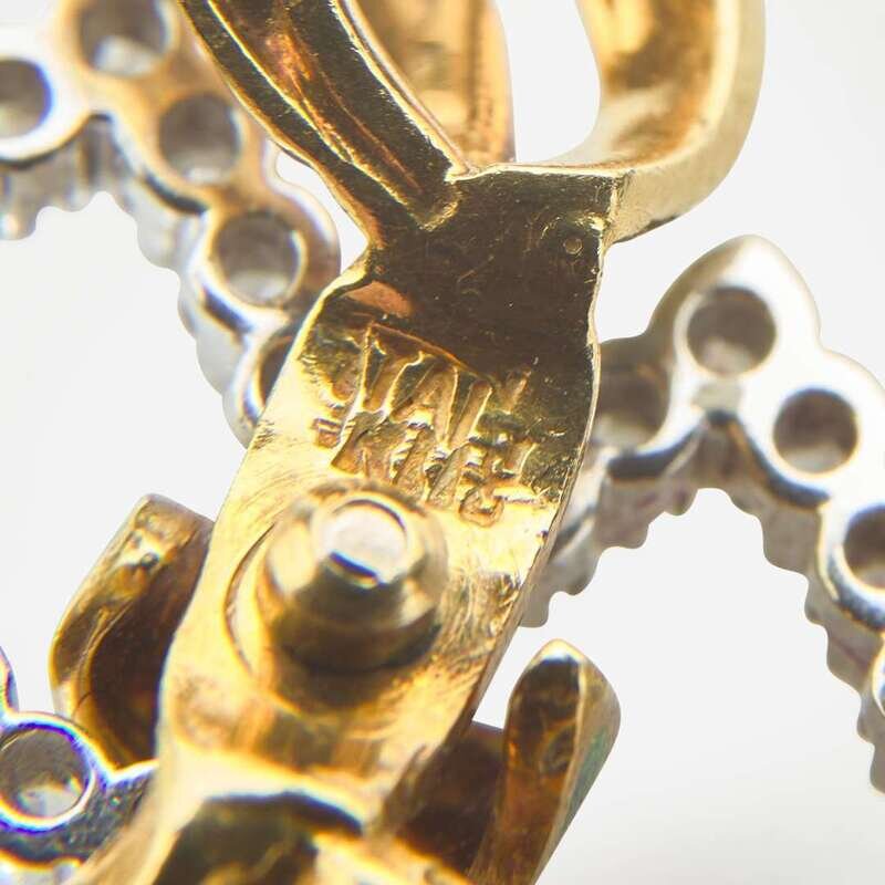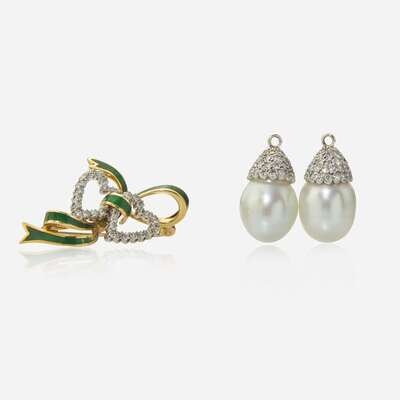 A Diamond and Enamel Bow Pin and Pearl and Diamond Earring Jackets