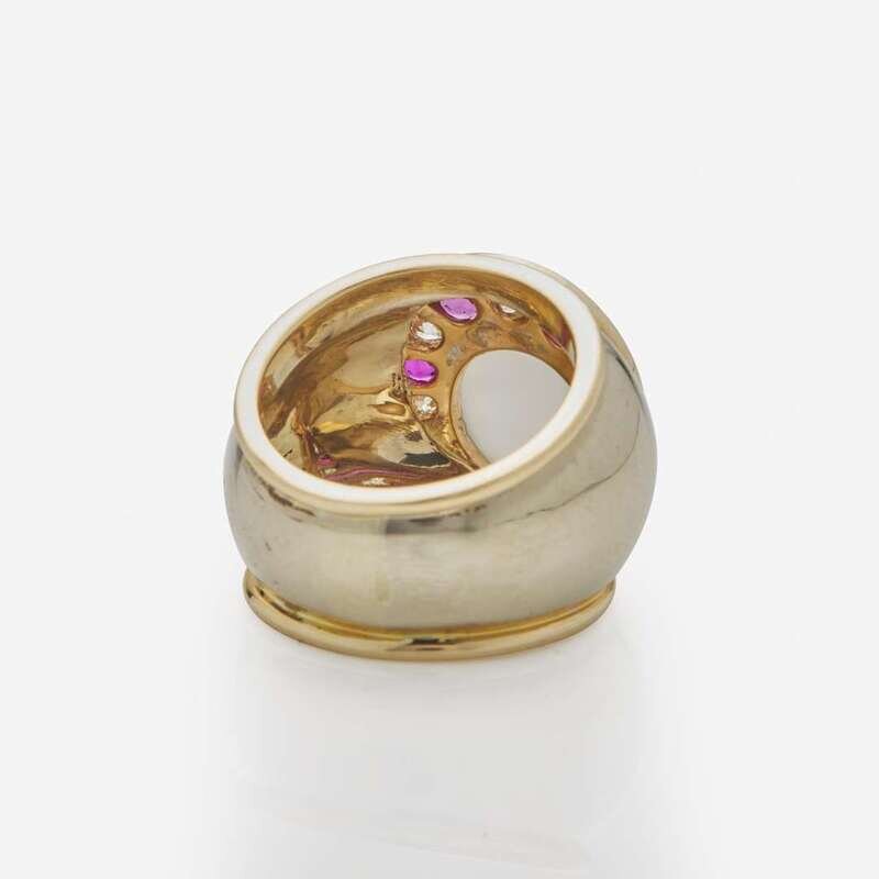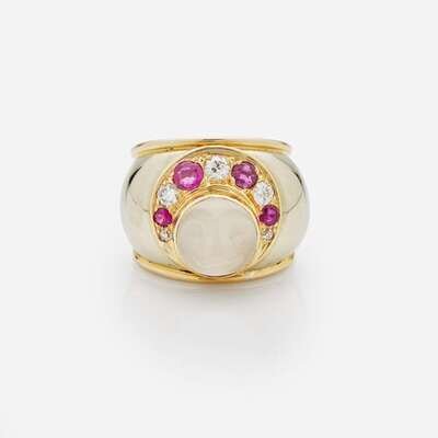 A 14K yellow gold ring centering round carved glass depicting a man in the moon, accented by four round-cut rubies measuring from approximately 2.20mm at the smallest to 3.60mm at the largest, and five old European-cut and round brilliant-cut diamonds. Diamonds are near colorless (H - I), with VS - I clarity. Total estimated weight of diamonds: 0.50 carats.