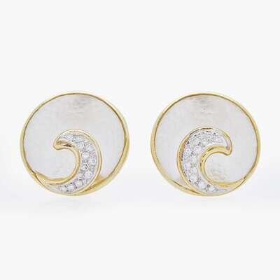 A pair of 18K yellow gold ear clips, each centering a carved rock crystal quartz measuring approximately 25.00mm, with a swirl of twenty-six round brilliant-cut accent diamonds. Diamonds are near colorless (H - I), with SI - I clarity. Total estimated weight of diamonds: 0.80 carats.