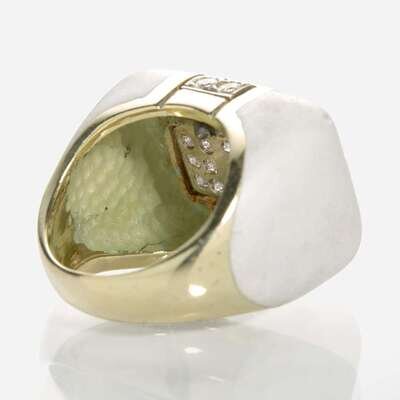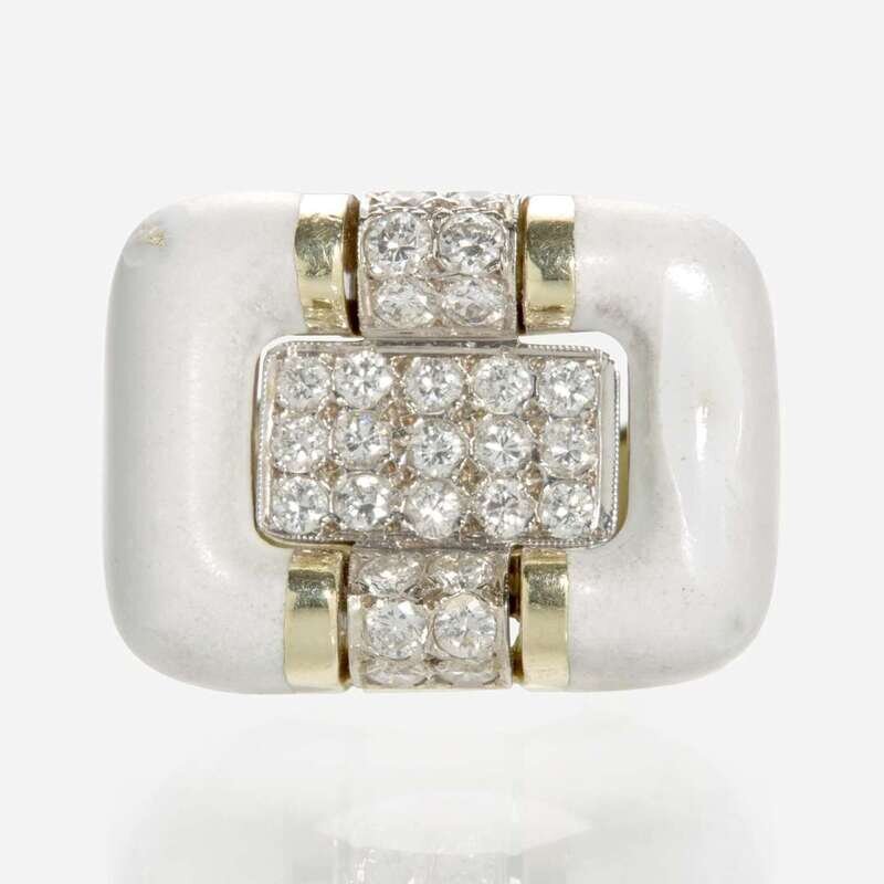 A 14K yellow gold ring designed as in a white enamel rectangle filled with twenty-seven round brilliant-cut diamonds. Diamonds are near colorless (G - H) with VS clarity. Total estimated weight of diamonds: 1.35 carats.