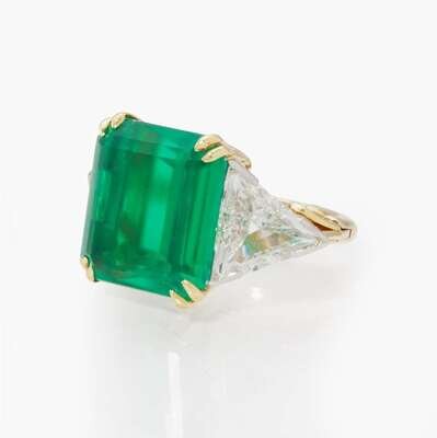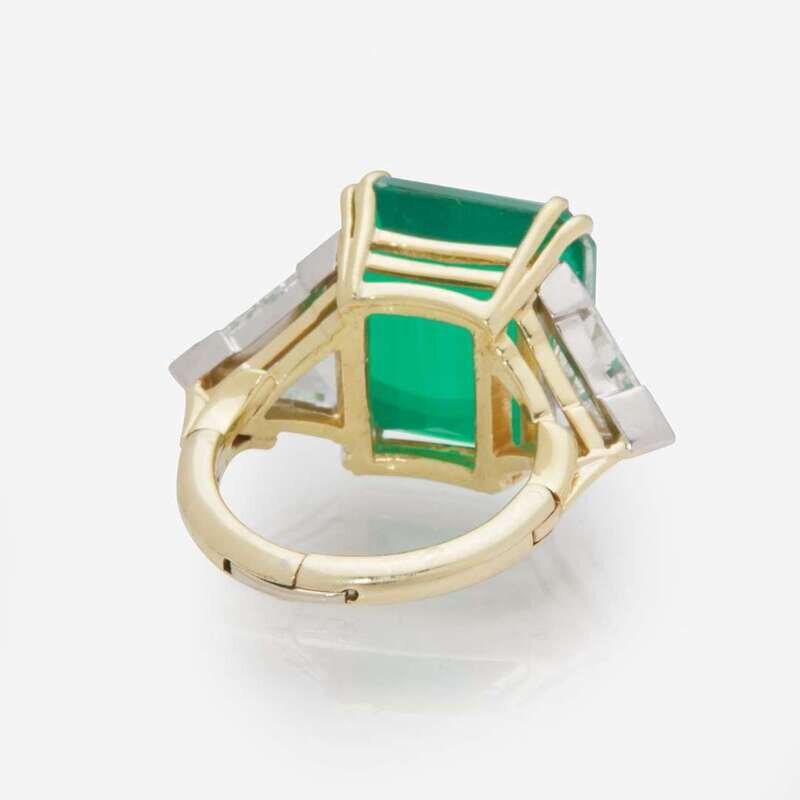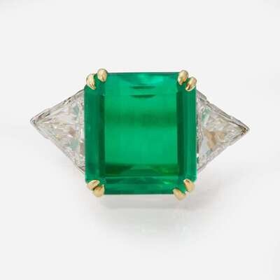 A 14K yellow gold ring centering an emerald-cut green glass stone measuring approximately 13.04mm x 14.27mm flanked by two trillion-cut diamonds set in 14K white gold. Diamonds are near colorless (J - K), with SI clarity. Total estimated weight of diamonds: 2.80 carats.