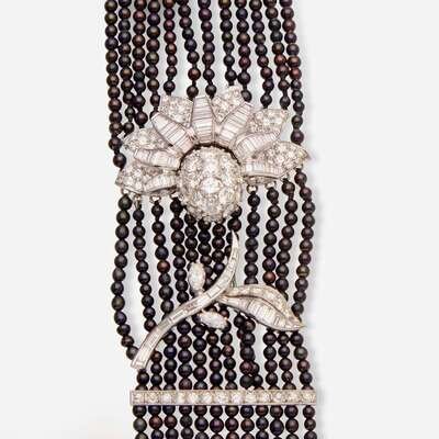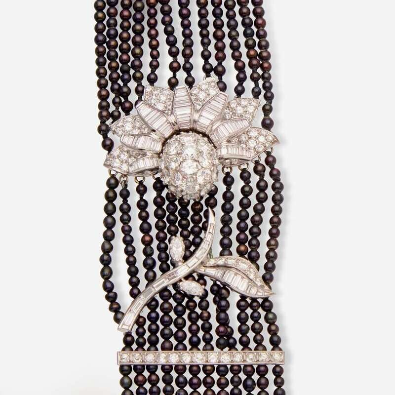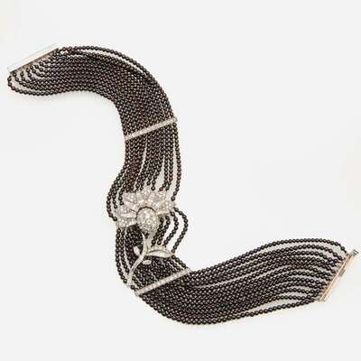 A 14K white gold choker necklace, designed as twelve strands of black seed pearls, each pearl measuring approximately 2.95mm, and centering a floral motif set with marquise-cut, baguette-cut, and round brilliant-cut diamonds. Diamonds are near colorless (F - G), with VS clarity. Total estimated weight of diamonds: 11.50 carats.
