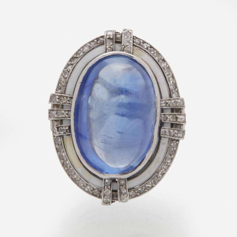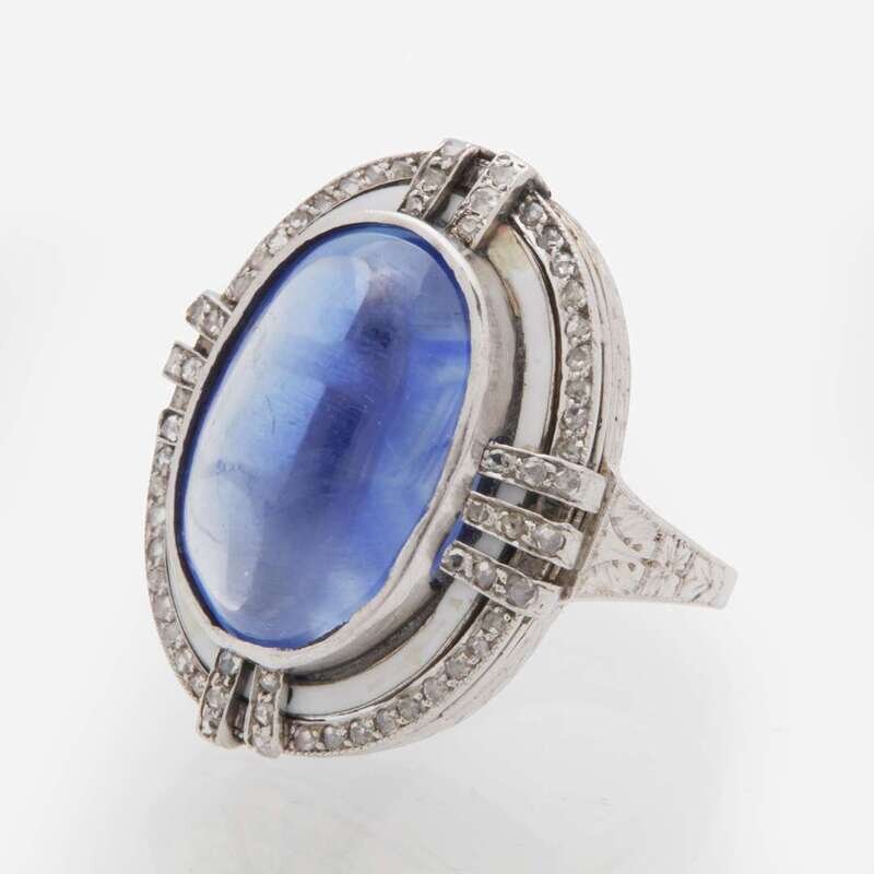 A 14K white gold ring centering a sugarloaf sapphire measuring approximately 18.64mm x 13.11mm x 9.64mm, surrounded by a ring of white enamel and accented by seventy-two near-colorless rose-cut diamonds. Total estimated weight of diamonds: 0.45 carats.