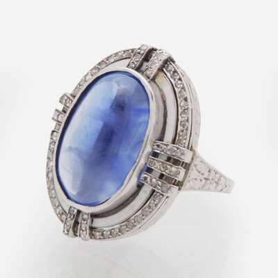 A 14K White Gold, Sugarloaf Sapphire, and Diamond Ring