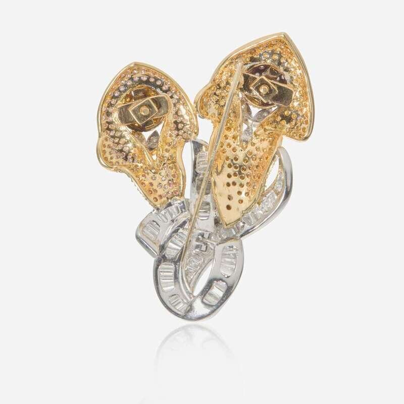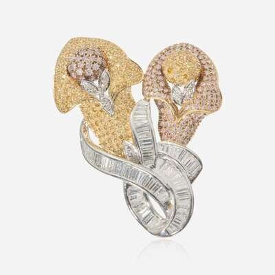 An 18K yellow and white gold pendant designed as two flowers, set with pink and yellow round brilliant-cut diamonds, and near colorless (G - H) baguette-cut and round brilliant-cut diamonds. Diamonds are SI clarity. Total estimated weight of diamonds: 5.64 carats.