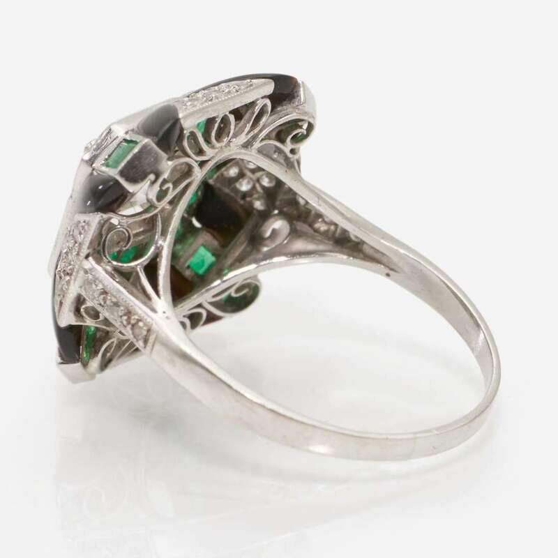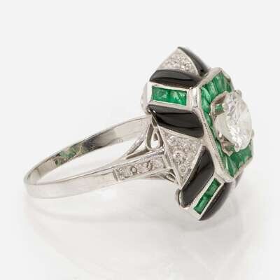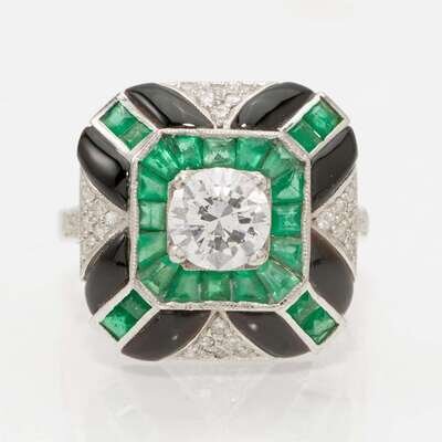 A platinum ring, centering a round brilliant-cut diamond weighing approximately 0.75 carats, surrounded by a geometrical layout of twenty-six round-cut diamonds each measuring approximately 1.00mm, twenty-four calibre-cut emeralds, and accents of black onyx each measuring approximately 2.10mm x 5.80mm. Diamonds are near colorless (H - I), with SI clarity. Total estimated weight of diamonds: 0.88 carats.