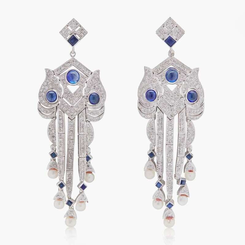 A pair of platinum dangle earrings on post studs, with six cabochon sapphires each measuring from approximately 4.10mm x 4.10mm at the smallest to 5.12mm x 4.73mm at the largest, twelve step-cut sapphires measuring from approximately 1.68mm x 1.80mm at the smallest to 3.38mm x 3.38mm at the largest, ten cultured pearls each measuring approximately 4.20mm, and approximately three hundred fifty single-cut diamonds. Total estimate of diamonds: 4.00 carats.