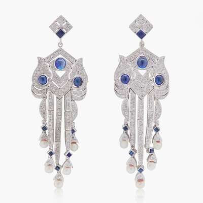 A Pair of Platinum, Diamond, Sapphire, and Pearl Earrings