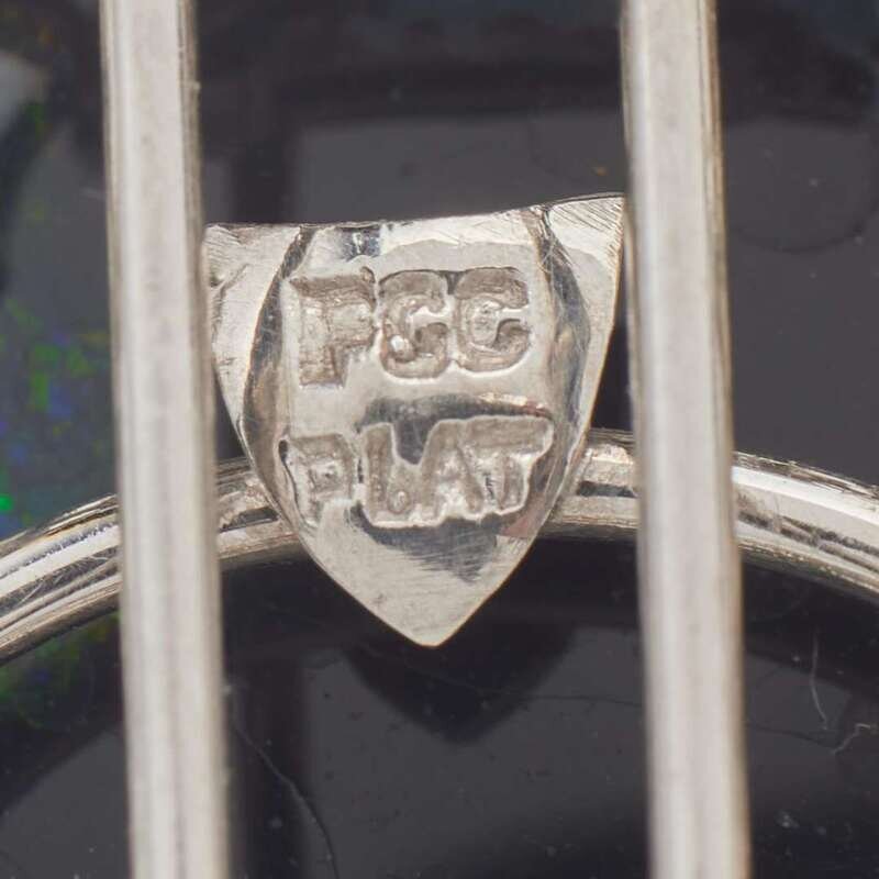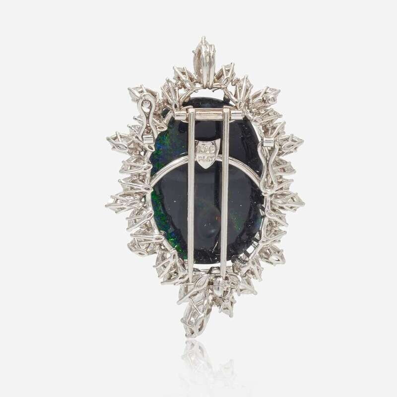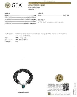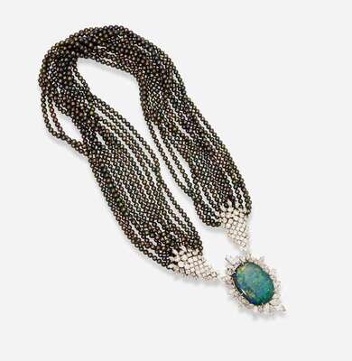 A multi-strand black pearl necklace centering a platinum, diamond, and black opal pendant. The pendant acts as the clasp, and centers a GIA Certified oval-cut black opal accented by round-cut and marquise-cut diamonds of varying sizes. Diamonds are near colorless (G - H), with VS clarity. Total estimated weight of diamonds: 10.00 carats. Black opal is accompanied by GIA Report Number: 2221835158.