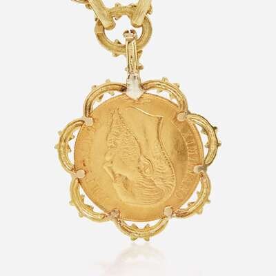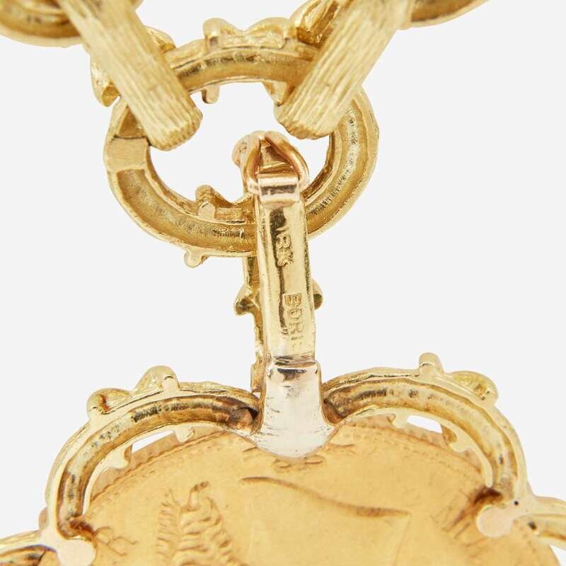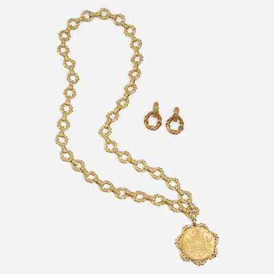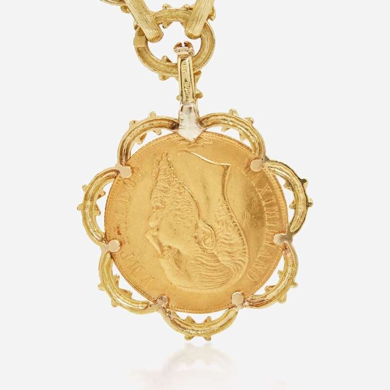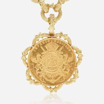 An 18K yellow gold textured link necklace with a detachable Mexican Empire twenty peso gold coin depicting Emperor Maximilian I, and a matching set of convertible-length earrings. The coin's obverse is designed with Miximilian's bust, and reverse is designed with crowned imperial arms on top of crossed swords, flanked by griffins.