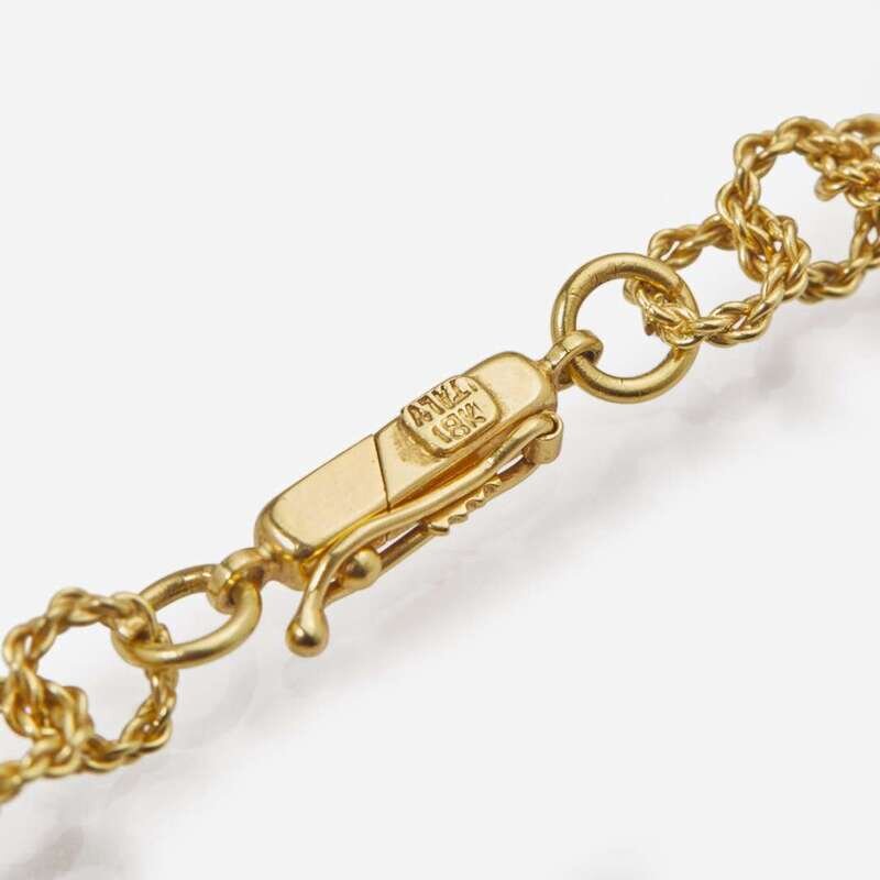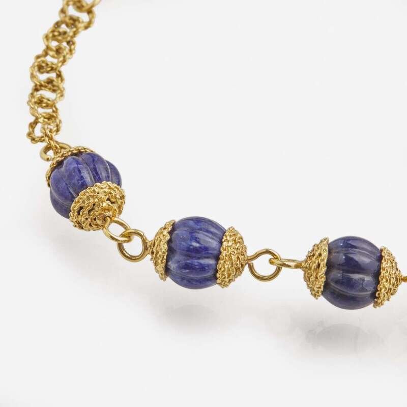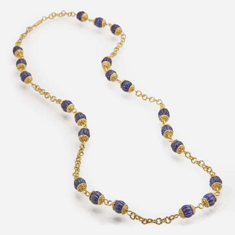An 18K yellow gold Italian textured link necklace featuring twenty-one carved blue sodalite beads each measuring approximately 12.00mm.
