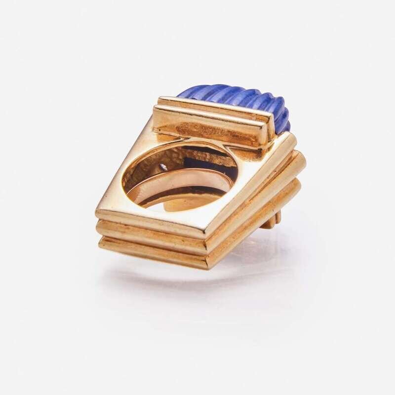 A geometric 18K yellow gold ring featuring a dome of carved lapis lazuli flanked by six round brilliant-cut diamonds. Diamonds are near colorless (G - H), with V - S clarity. Total estimated weight of diamonds: 0.44 carats.