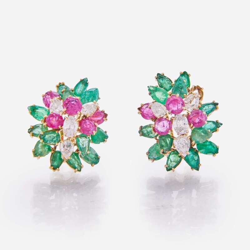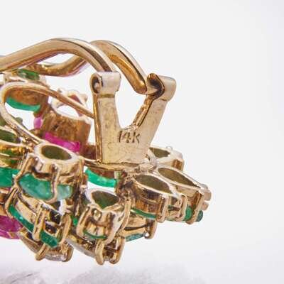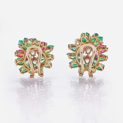A pair of 14K yellow gold ear clips, set with twenty-six pear-shape emeralds measuring from approximately 8.00mm x 4.55mm to 5.40mm x 3.21mm, nine round-cut rubies measuring from approximately 5.20mm at the smallest to 5.78mm at the largest, an oval-cut diamond measuring approximately 6.04mm x 4.57mm, an oval-cut diamond measuring approximately 7.09mm x 4.32mm, and six pear-shape diamonds measuring from approximately 7.46mm x 4.77mm to 6.00mm x 3.58mm. Diamonds are near colorless (H - I), with SI clarity. Total estimated weight of diamonds: 3.50 carats.