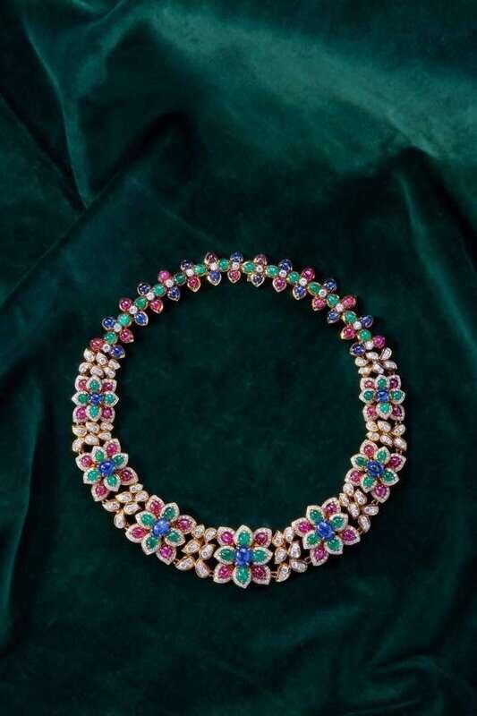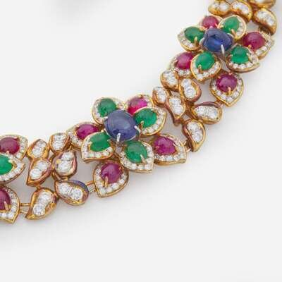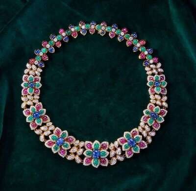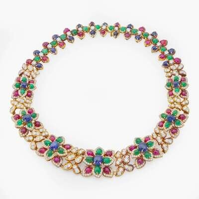 An 18K yellow gold collar-style necklace, designed as a row of flowers made up of cabochon emeralds, sapphires, and rubies, and accented by an array of round brilliant-cut diamonds. Diamonds are near colorless (G - J), with SI clarity. Total estimated weight of diamonds: 16.00 carats.