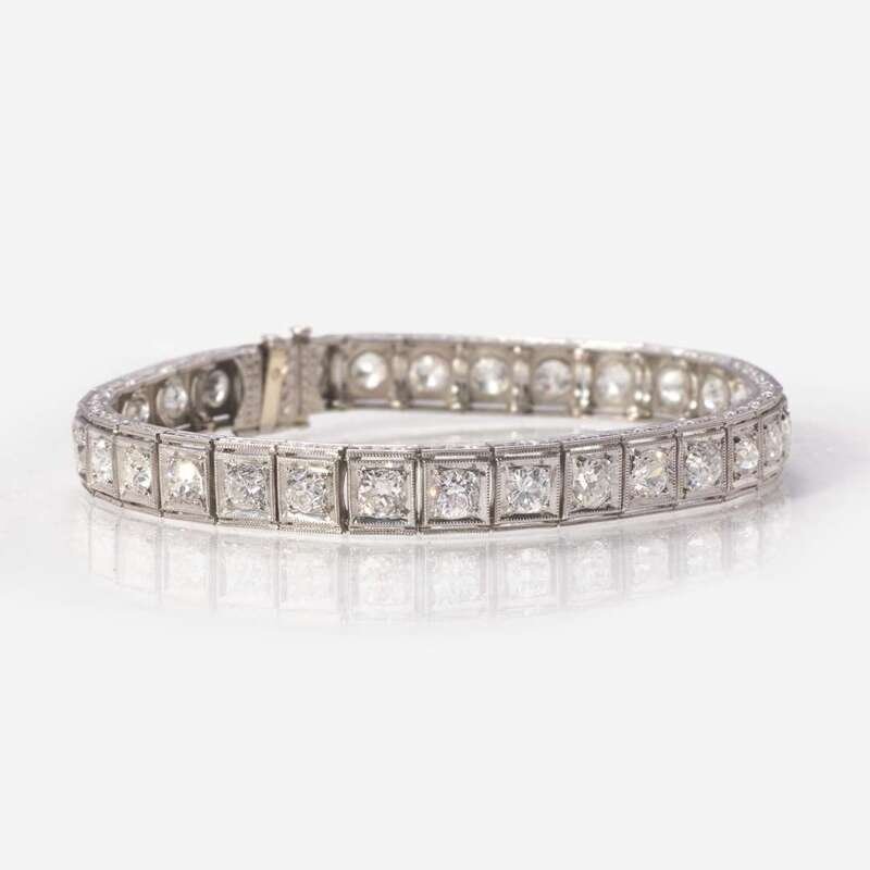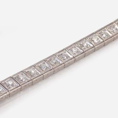 An Art Deco platinum line bracelet, set with thirty-two old European-cut diamonds. Diamonds are near colorless (G - I), with SI - I clarity. Total estimated weight of diamonds: 8.00 carats.