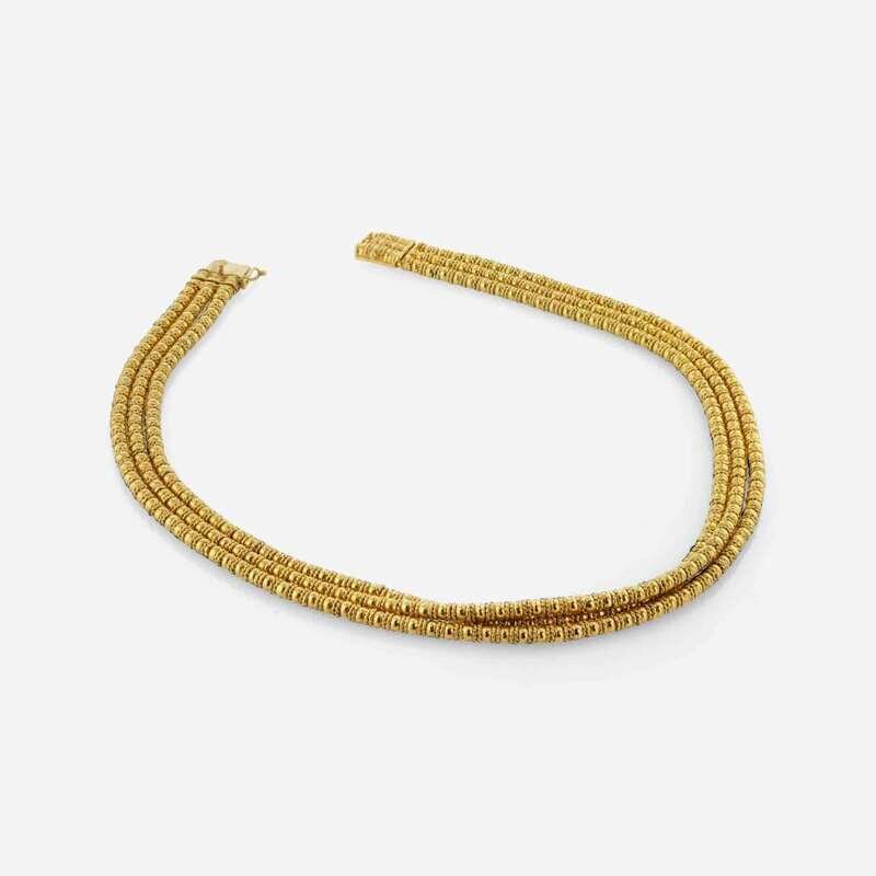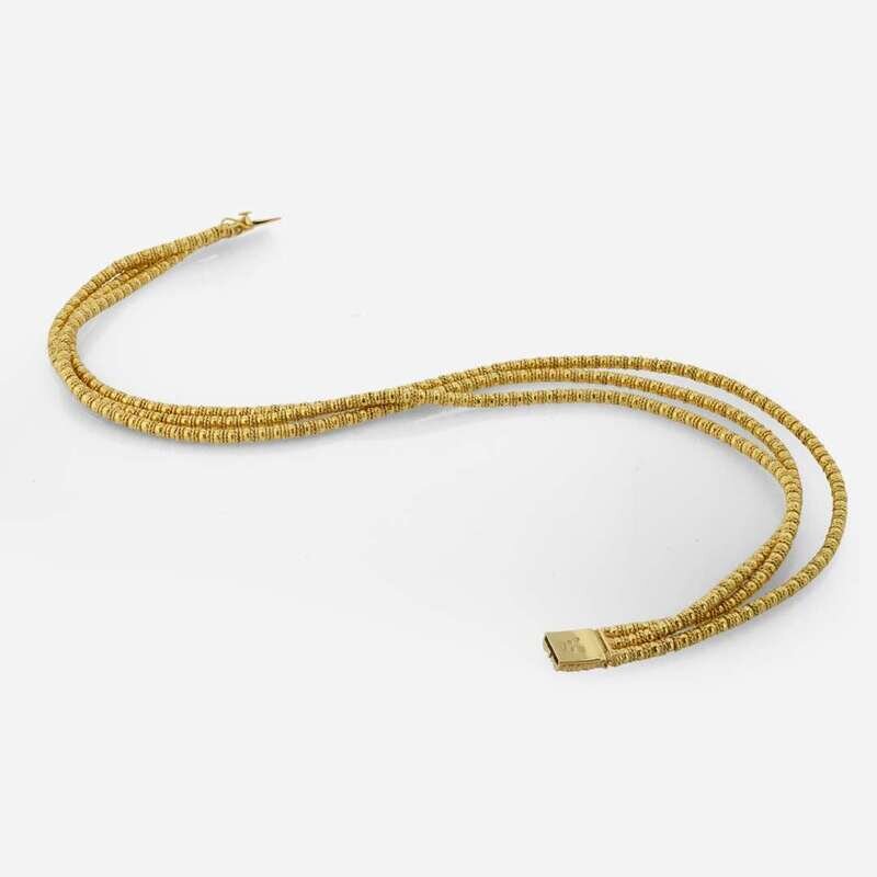 An 18K yellow gold necklace, designed as three strands of varying length, made in Greece by artist Ilias LaLounis.