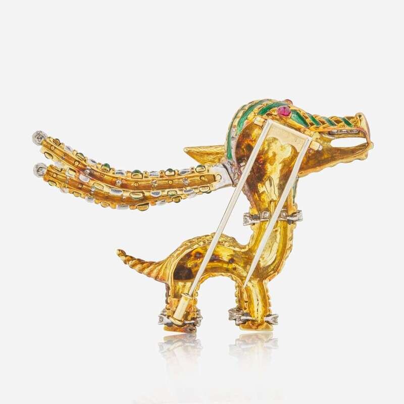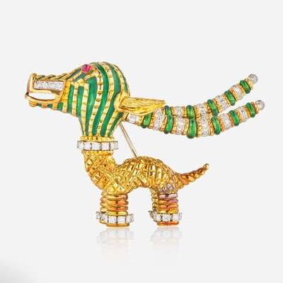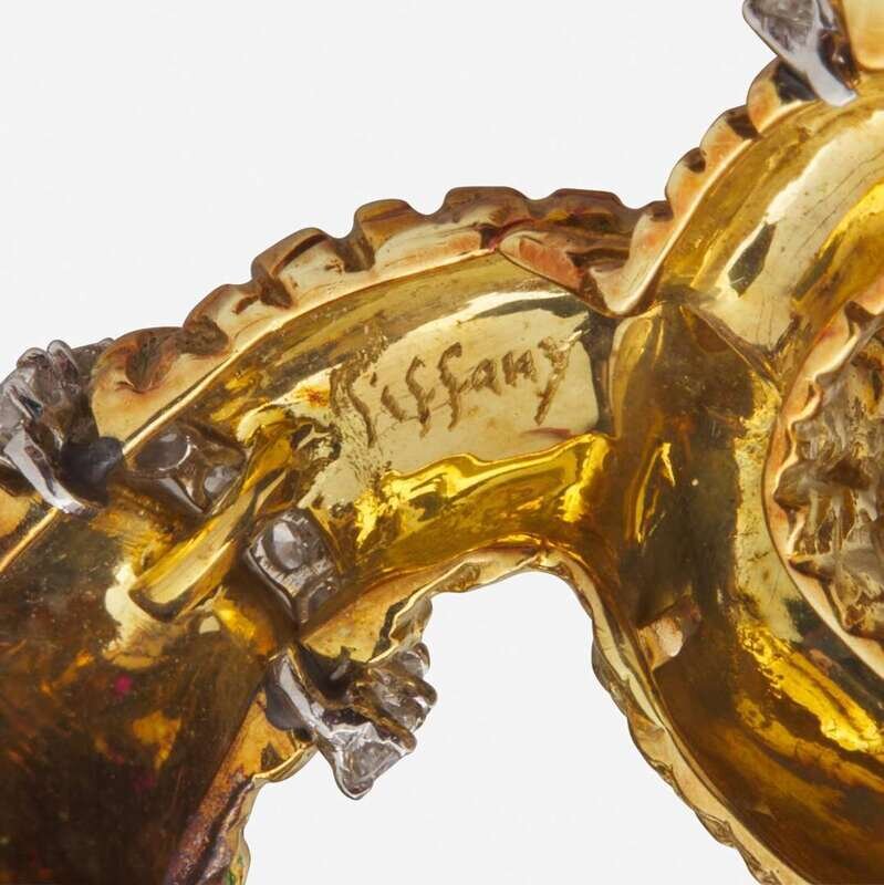 An 18K yellow gold brooch by Aldo Cippulo for Tiffany & Co. circa 1970, designed as a large-horned animal inspired by a ceremonial African tribal figure. The creature is set with applied guilloche enamel with two round-cut cabochon rubies each measuring approximately 2.00mm for eyes, and accented by single-cut and round brilliant-cut diamonds set in platinum. Diamonds are near colorless (E - F), with VS clarity. Total estimated weight of diamonds: 2.00 carats.