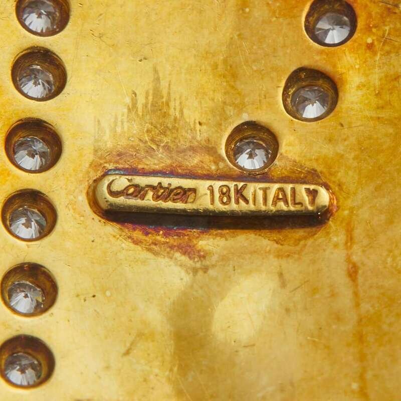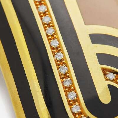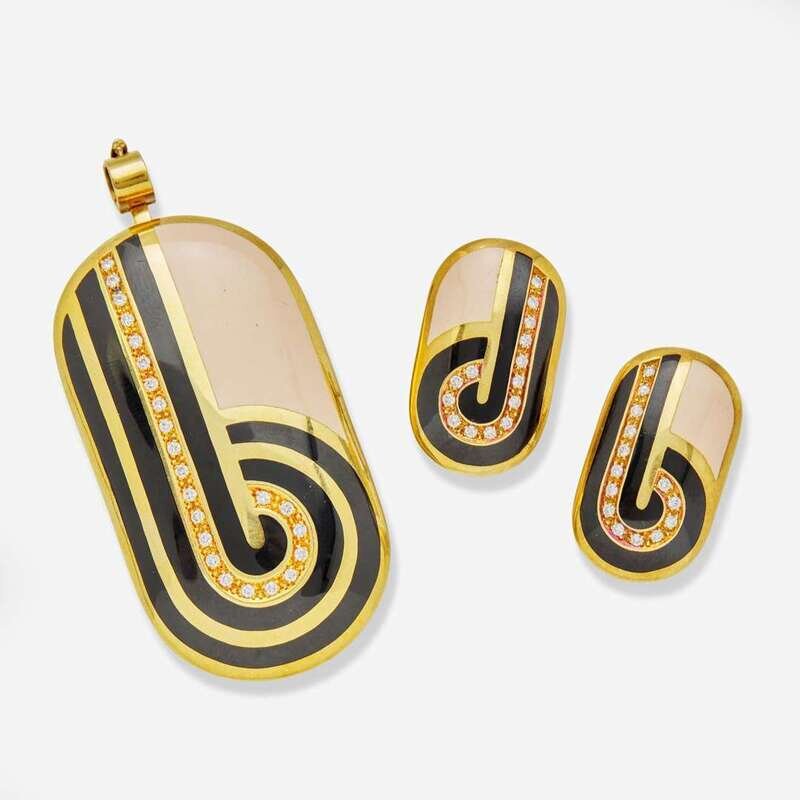 A gold, black and pink enamel, and diamond suite of earrings and brooch, also functioning as a pendant, set in 18K yellow gold from Italy. The suite features fifty-one round brilliant-cut diamonds altogether, near colorless (G - H), with VS clarity. Total estimated weight of diamonds: 1.55 carats.
