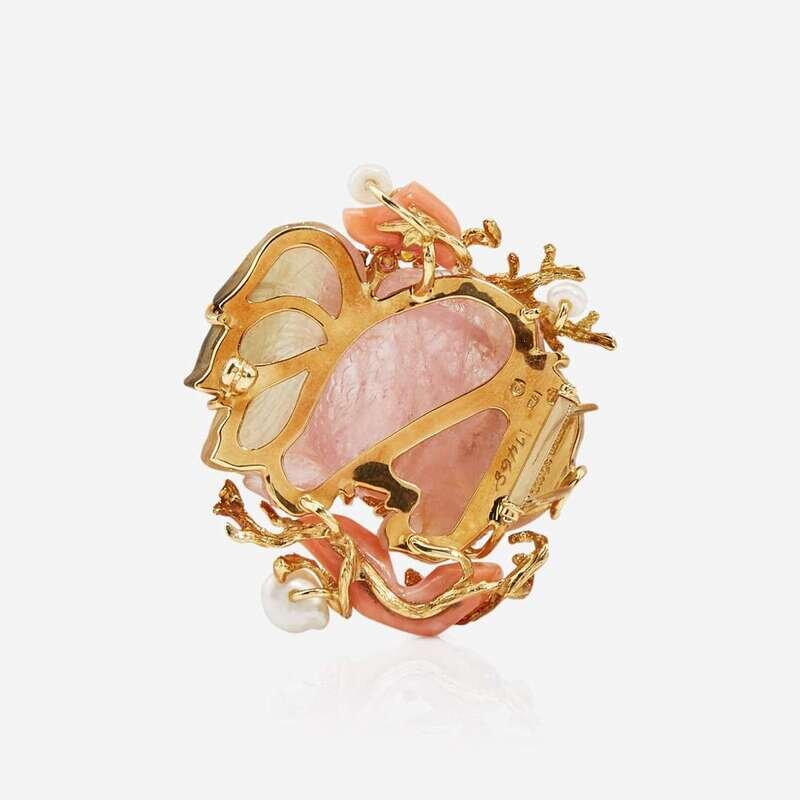 An 18K yellow gold brooch by Seaman Schepps, designed as a carved watermelon-shape tourmaline tropical fish. The brooch is set with a round-cut emerald eye, yellow topaz, and pink sapphire, all measuring from approximately 1.75mm at the smallest to 2.40mm at the largest. This whimsical brooch is further accented by coral branches and freshwater pearls. Accompanied by Seaman Schepps box.