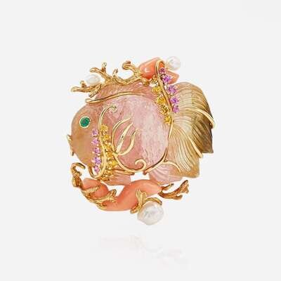 A Seaman Schepps Carved Tourmaline Gem-Set Tropical Fish Pin