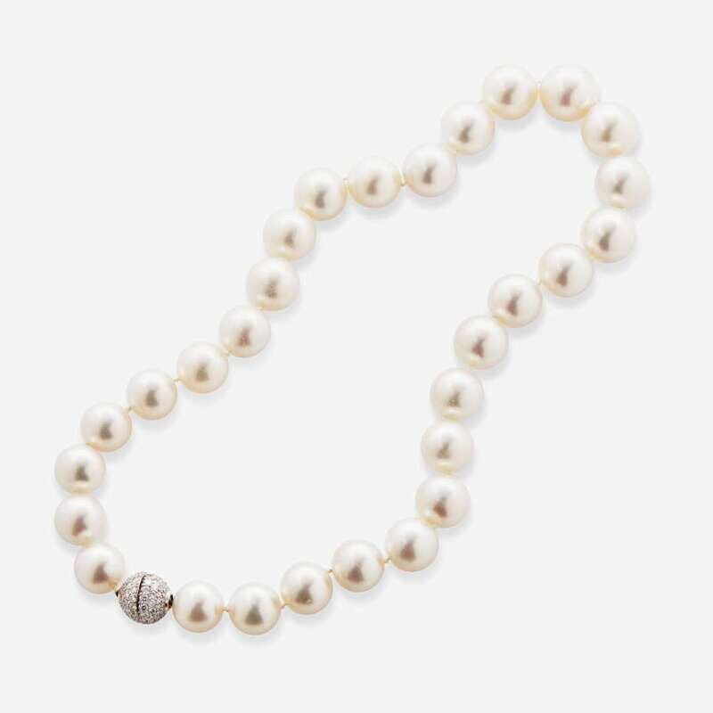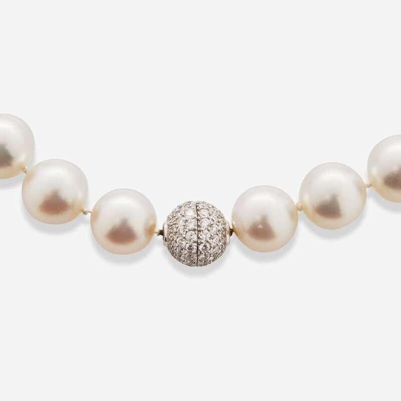 A Tara & Sons strand of twenty-nine round white South Sea pearls measuring from approximately 13.00mm at the smallest to 16.00mm at the largest, with two additional loose pearls each measuring approximately 13.00mm, and 18K screw closure pavé-set with round brilliant-cut diamonds. Diamonds are near colorless (G - H), with VS clarity. Total estimated weight of diamonds: 2.50 carats.