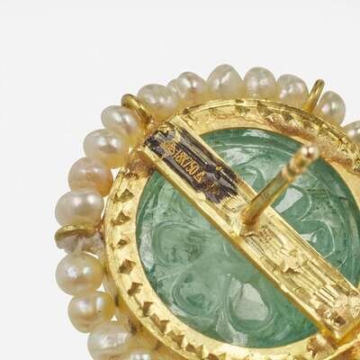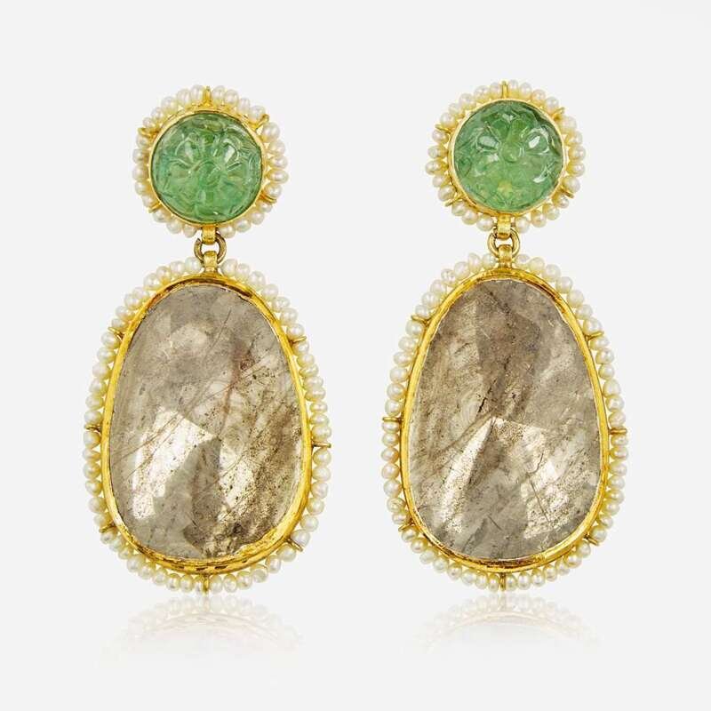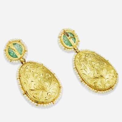 A Pair of 18K Yellow Gold, Polki Diamond, Pearl, and Emerald Earrings