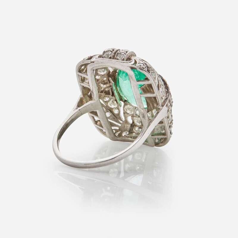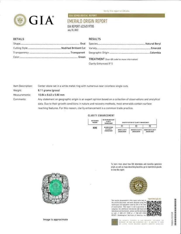 An Art Deco platinum ring featuring a transparent green modified brilliant oval-cut natural beryl Columbian emerald measuring approximately 10.84mm x 8.62mm x 5.80mm, approximately 3.00 carats, accented by sixty-four single-cut diamonds. Diamonds are near colorless G-J, with VS - SI clarity. Total estimated weight of diamonds: 1.65 carats.