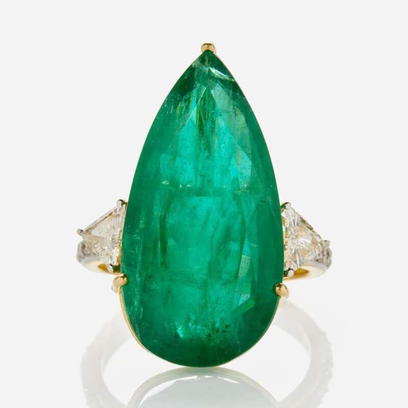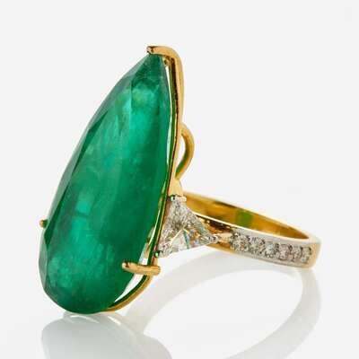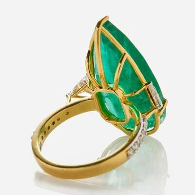 An 18K yellow gold ring centering a pear-shape emerald measuring approximately 25.60mm x 12.78mm, approximately 15.64 carats, flanked by two trillion-cut diamonds each weighing approximately 0.25 carats, and twelve round brilliant-cut diamonds leading down the shank. Diamonds are near colorless G-J, with SI-I1 clarity. Total estimated weight of diamonds: 0.71 carats.