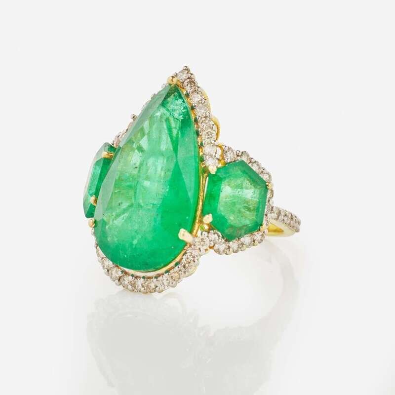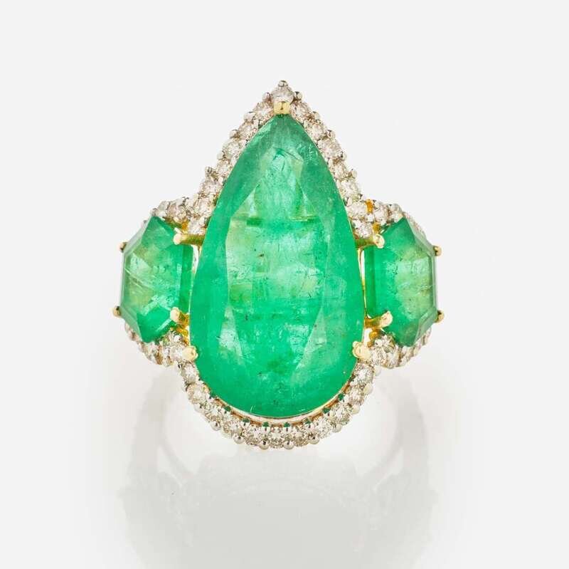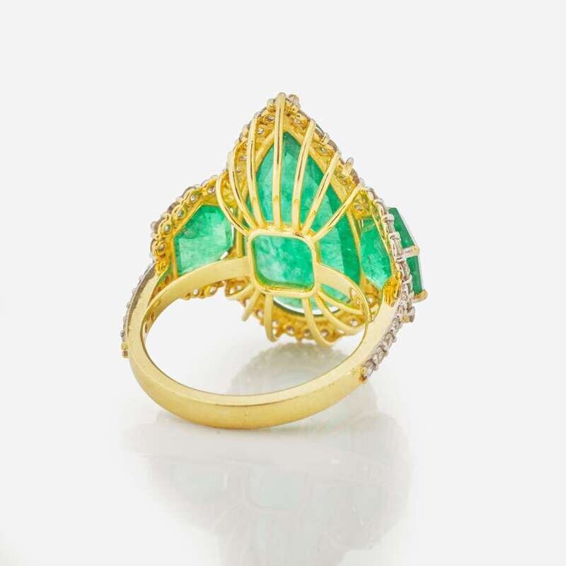 An 18K yellow gold ring centering a pear-shaped emerald measuring approximately 21.00mm x 11.95mm, approximately 10.25 carats, flanked by two hexagonal-cut emeralds each measuring approximately 7.22mm x 9.24mm, approximately 3.53 carats together, and accented by sixty-four round brilliant-cut diamonds. Diamonds are near colorless (G - J), with SI clarity. Total estimated weight of diamonds: 1.23 carats.
