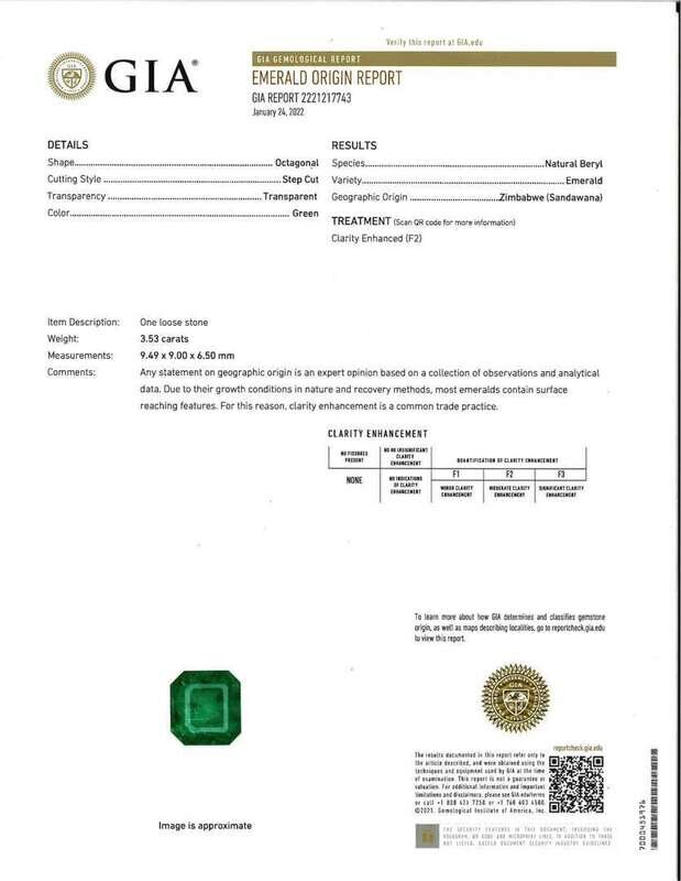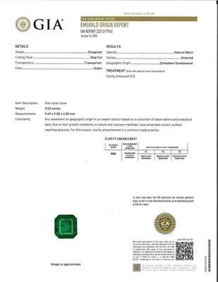 An 18K yellow gold ring centering an octagonal step-cut natural green beryl emerald from Zimbabwe (Sandawana) measuring approximately 9.49mm x 9.00mm x 6.50mm, 3.53 carats, clarity enhanced (F2), and surrounded by baguette-cut diamonds. Diamonds are near colorless (F - G), with VS1 clarity. Total estimated weight of diamonds: 3.00 carats. Emerald accompanied by GIA Report Number: 2221217743.