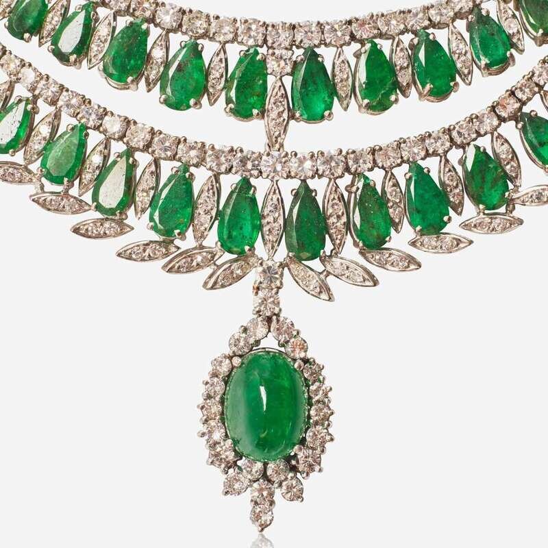 An Art Deco-inspired platinum necklace, featuring one oval cabochon emerald measuring approximately 12.17mm x 9.11mm and two rows of twenty- eight pear-shape emeralds each measuring from approximately 6.34mm x 3.54mm at the smallest to 8.30mm x 4.35mm at the largest, accented by brilliant-cut, single-cut and baguette-cut diamonds. Diamonds are near colorless (G - J), with SI1 - I1 clarity. Total estimated weight of diamonds: 10.00 carats.